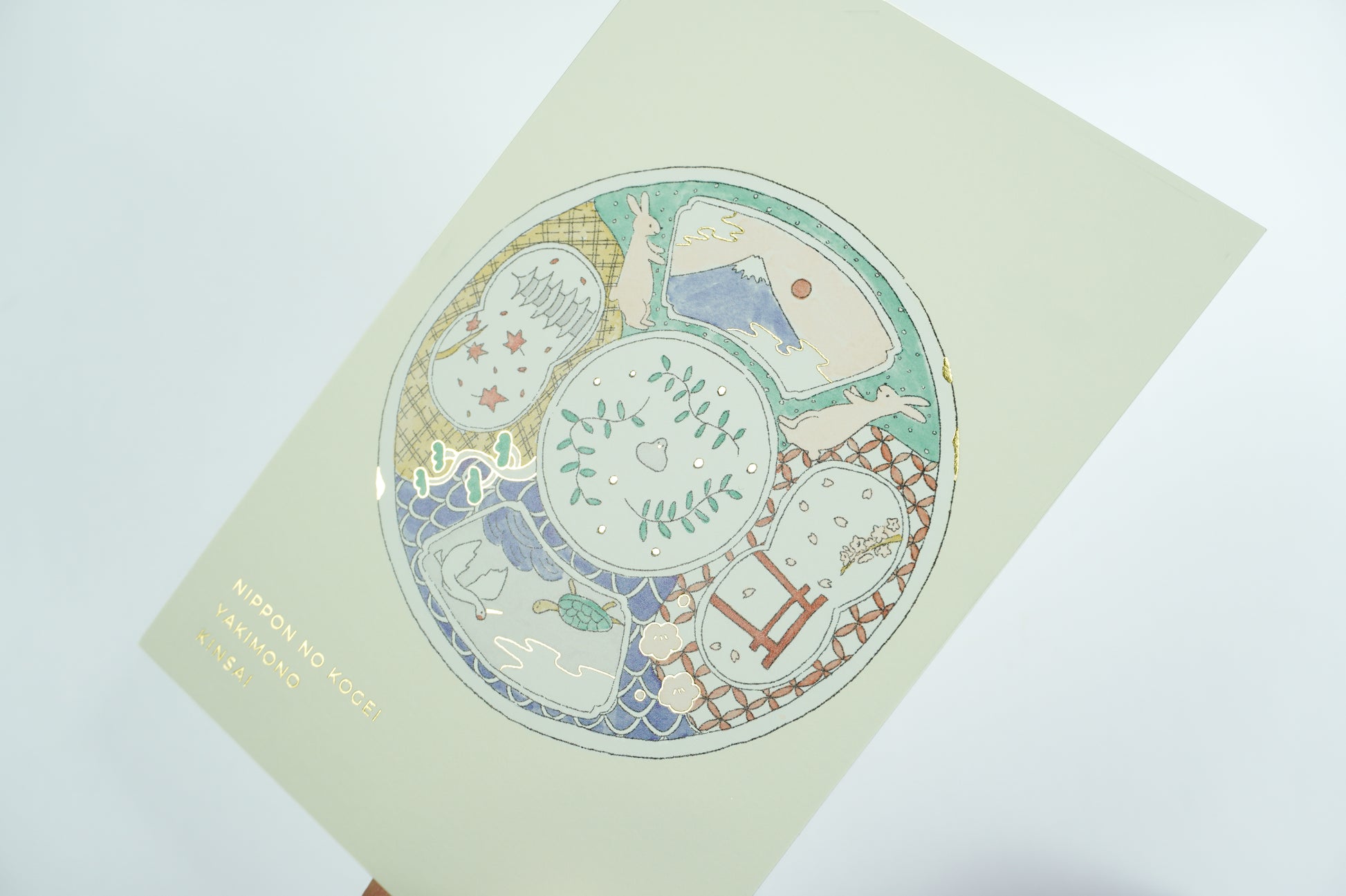 Diese Postkarte zeigt traditionelles japanisches Geschirr in sanften Farben, veredelt mit eleganter Goldprägung für eine festliche Atmosphäre. Die Rückseite ist ebenfalls im Vollfarb-Druck gestaltet.