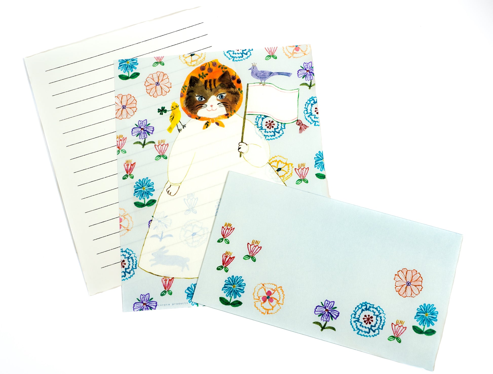 Ein charmantes Briefset der Illustratorin Aiko Fukawa: Rund um die Katze im niedlichen Kleid sind viele Blumen verstreut – und auch die Rückseite der Umschläge ist voller Blumen und einfach bezaubernd. Schreiben Sie Ihre Nachricht einfach ins fluffige Kleid.